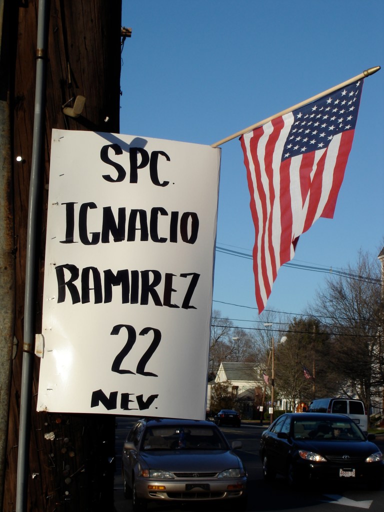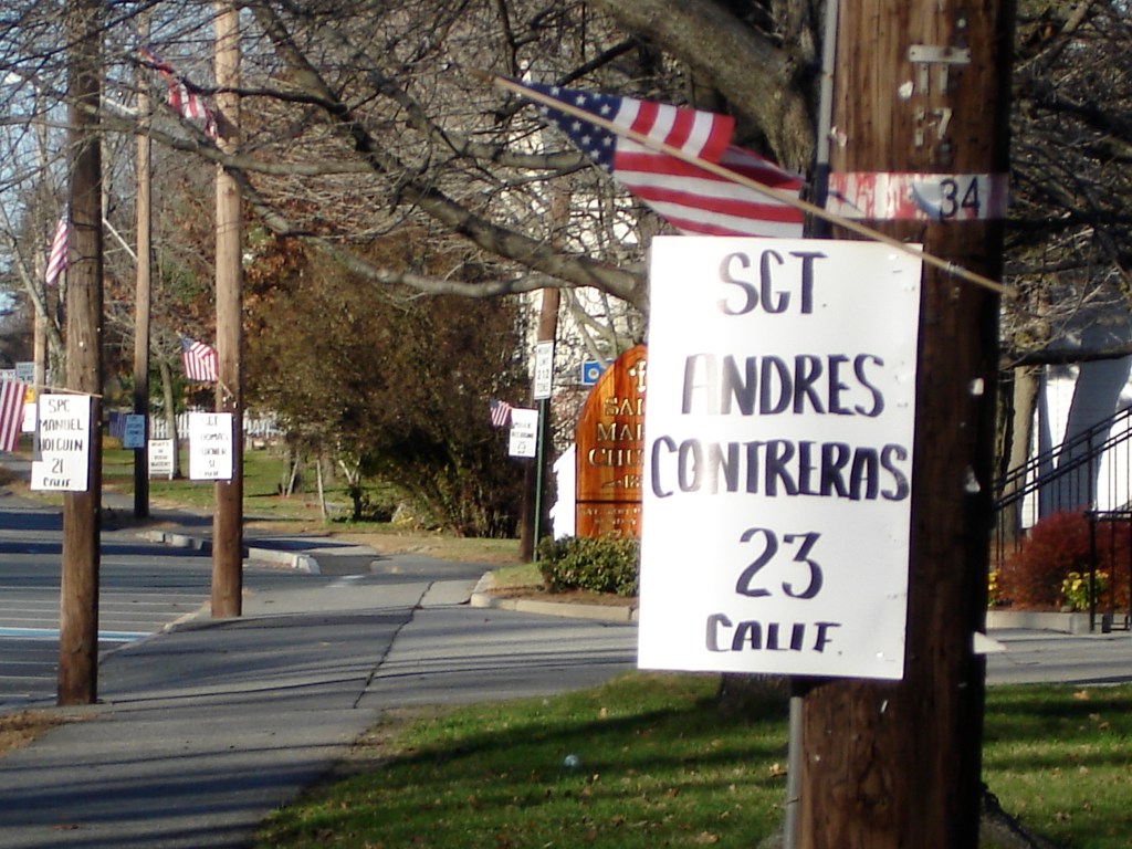 In the town of Holliston, Massachusetts, there is a veteran who has a mission. Each year he hand letters white signs in bold clear black letters with the name, rank, place of birth, and age of each soldier who died in the past year. He has been doing this each November since 2003. With the help of some of his friends, he posts the signs with the names facing the oncoming traffic in both directions on telephone poles that run through streets in town. Each sign has the flag of the country where the soldier was a citizen above the name. They are not all from the United States. They are not all men.
